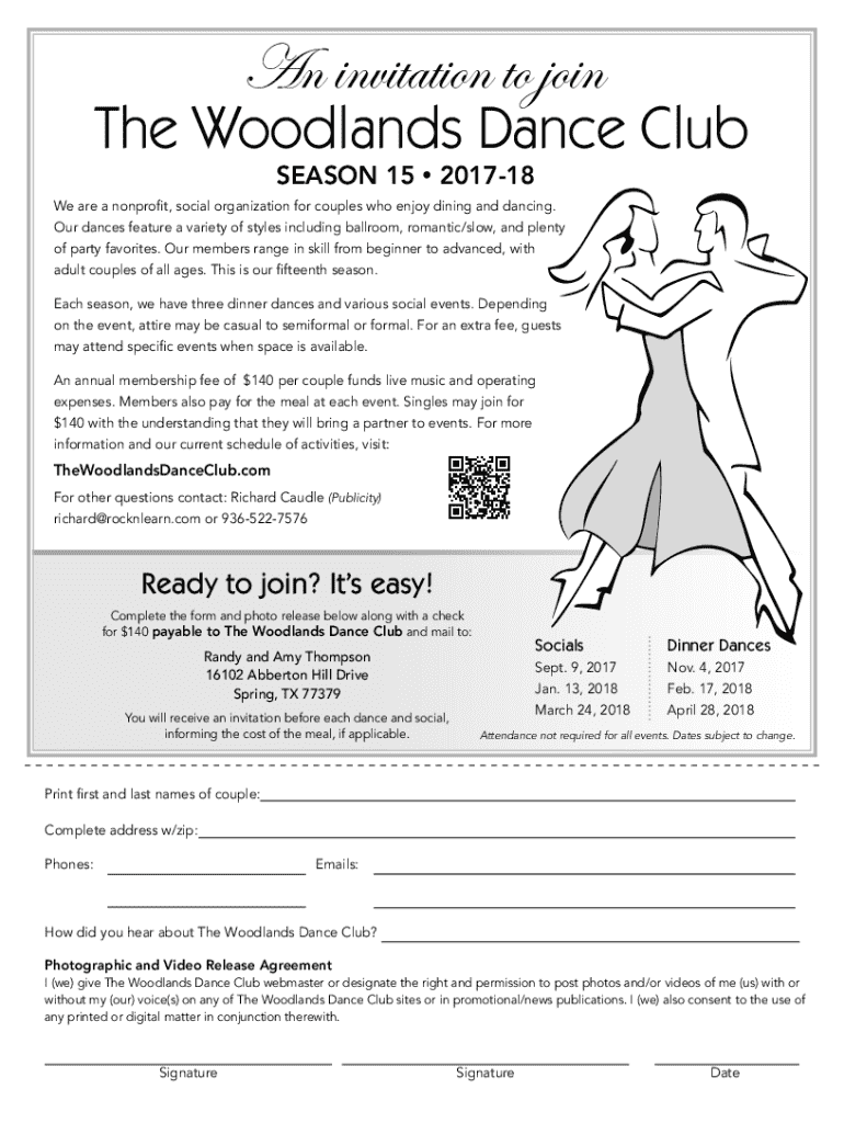 An invitation to joinThe Woodlands Dance Club SEASON 15 201718We are a nonprofit, social organization for couples who enjoy dining and dancing. Our dances feature a variety of styles including ballroom,