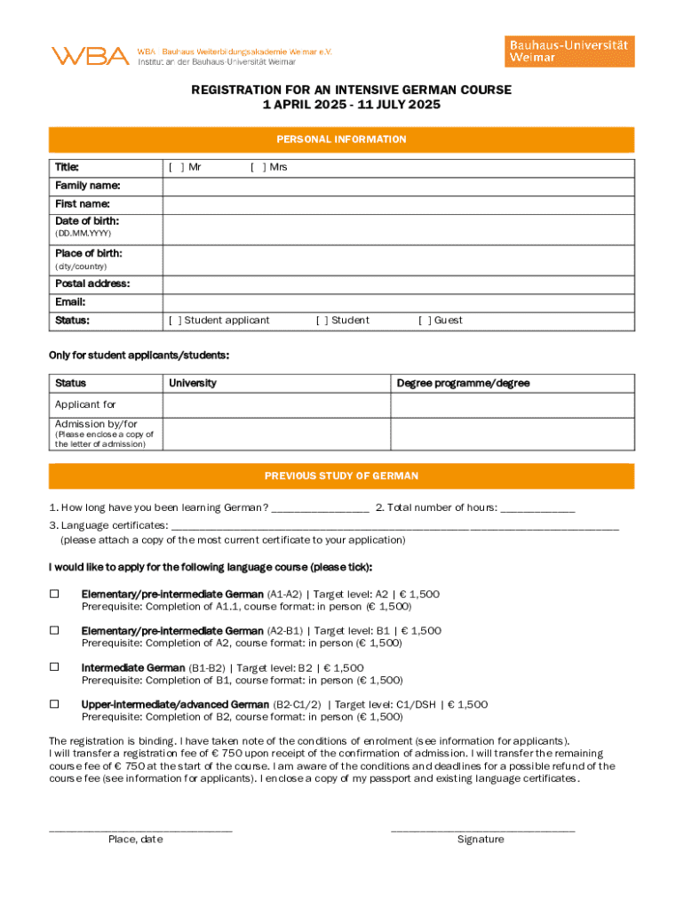 REGISTRATION FOR AN INTENSIVE GERMAN COURSE 1 APRIL 2025 11 JULY 2025 Persnliche Angaben PERSONAL INFORMATION Title:[ ] Mr[ ] MrsFamily name: First name: Date of birth: (DD.MM.YYYY)Place of birth: