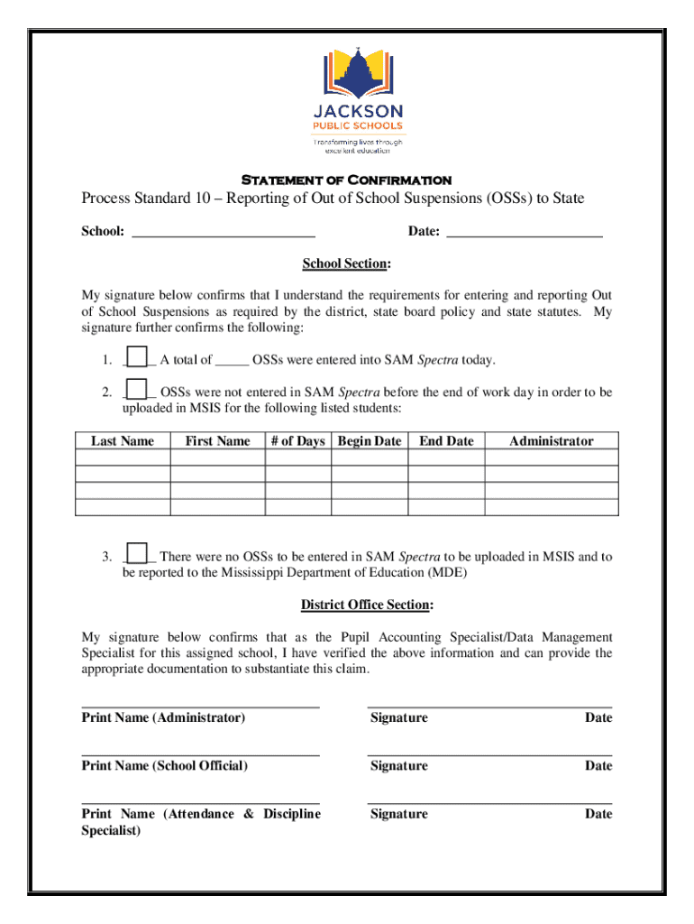 Statement of ConfirmationProcess Standard 10 Reporting of Out of School Suspensions (OSSs) to State School: ___Date: ___School Section: My signature below confirms that I understand the requirements