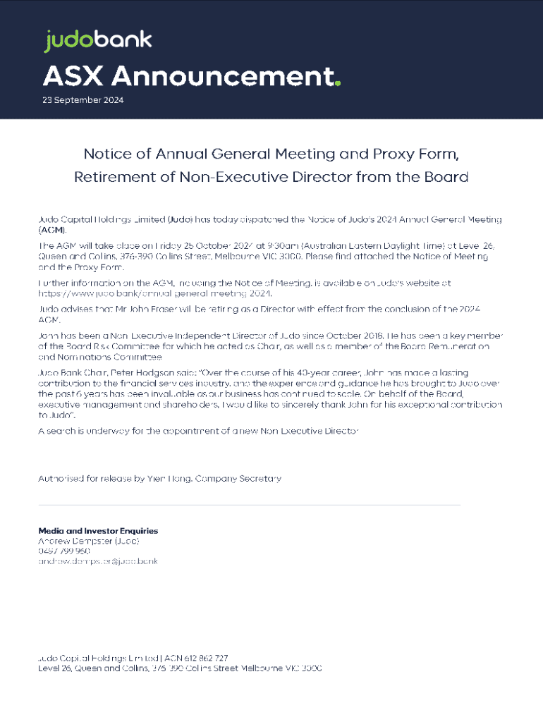Attend the Judo Capital Holdings Limited AGM on October 25, 2024. Discover key business updates and participate in important voting.