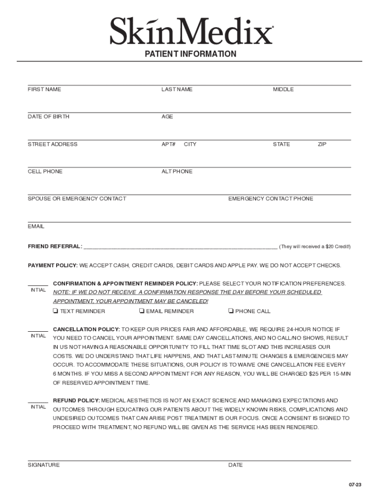 PATIENT INFORMATIONFIRST NAMELESS NAMEMIDDLEDATE OF BIRTHAGESTREET ADDRESS APT#CITYSTATEZIPCELL PHONE PHONESPOUSE OR EMERGENCY CONTACTEMERGENCY CONTACT PHONEMIC