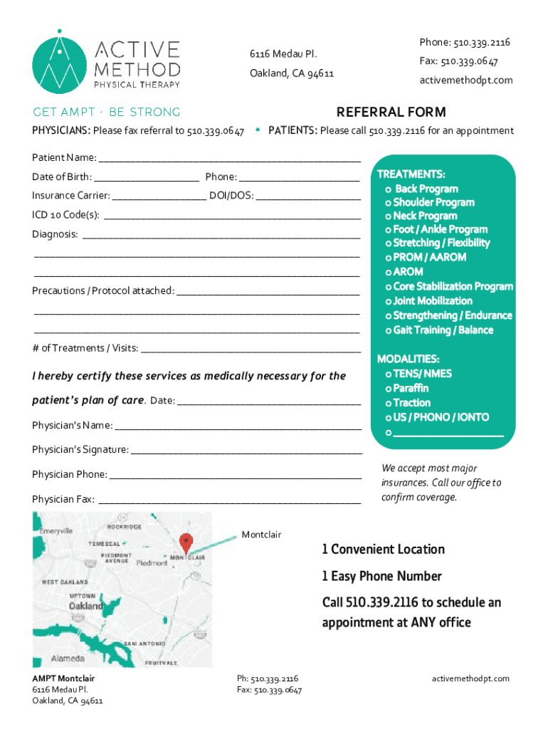 Complete the referral form for Active Method Physical Therapy to ensure medically necessary services are provided for patients. Call 510.339.2116 for appointments.