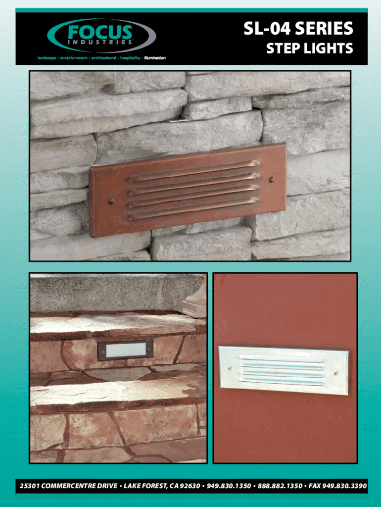 SL04 SERIES STEP LIGHTS25301 COMMERCENTRE DRIVE LAKE FOREST, CA 92630 949.830.1350 888.882.1350 FAX 949.830.3390TYPELEDBRICK LIGHTS SL04 SERIESREADYSPECIFICATIONS CONSTRUCTION: FACE PLATE: Heavy duty
