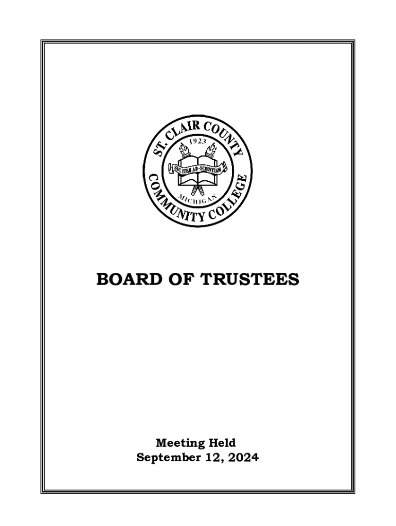 BOARD OF TRUSTEESMeeting Held September 12, 2024AGENDAST. CLAIR COUNTY COMMUNITY COLLEGE BOARD OF TRUSTEES REGULAR MEETING Thursday, September 12, 2024, at 4:30 p.m. Room 150 Welcome Center AGENDA