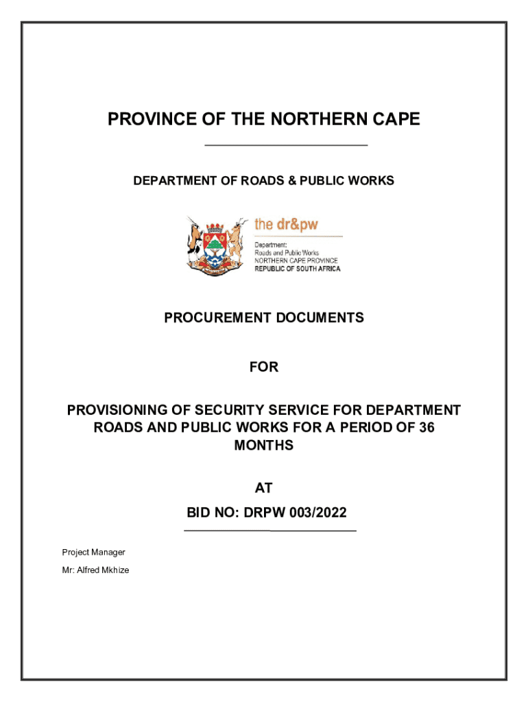 PROVINCE OF THE NORTHERN CAPE DEPARTMENT OF ROADS & PUBLIC WORKSPROCUREMENT DOCUMENTS FOR PROVISIONING OF SECURITY SERVICE FOR DEPARTMENT ROADS AND PUBLIC WORKS FOR A PERIOD OF 36 MONTHS AT BID NO: