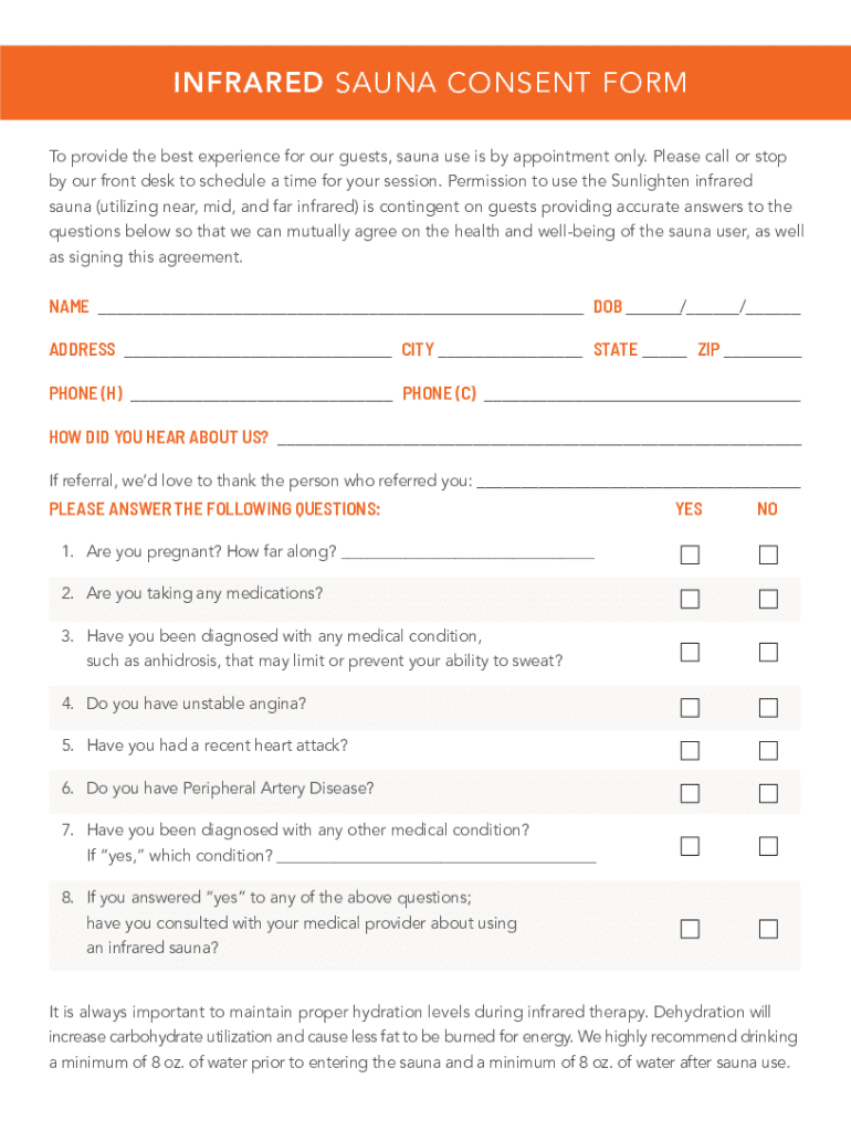 INFRARED SAUNA CONSENT FORM To provide the best experience for our guests, sauna use is by appointment only. Please call or stop by our front desk to schedule a time for your session. Permission to