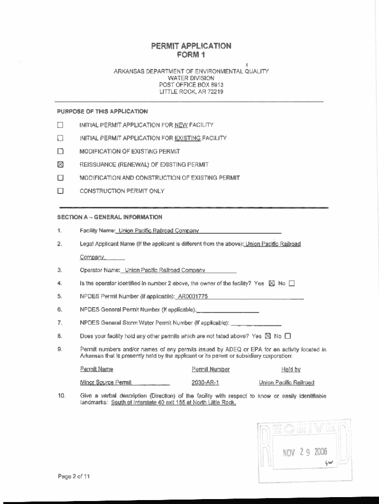 PERMIT APPLICATION FORM 1 ARKANSAS DEPARTMENT OF ENVIRONMENTAL QUALITY WATER DIVISION POST OFFICE BOX 8913 LITTLE ROCK, AR 72219 PURPOSE OF THIS APPLICATION INITIAL PERMIT APPLICATION FORFACILITYINITIAL