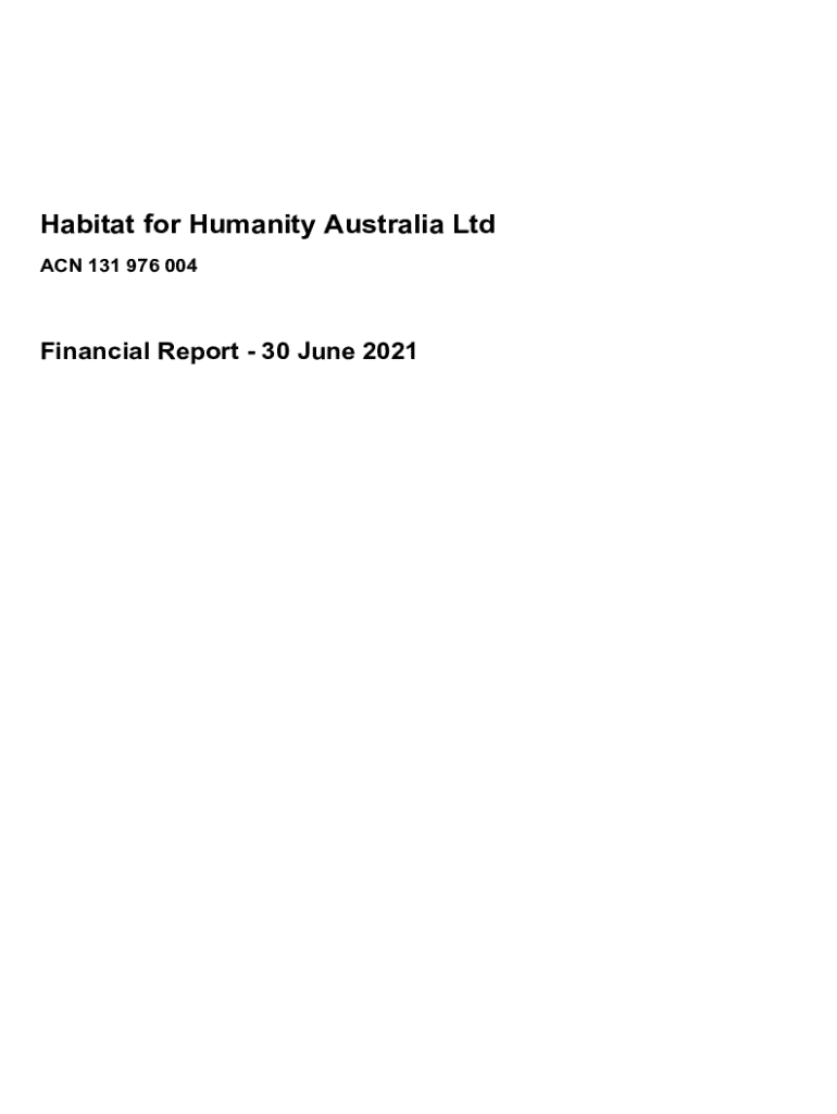 Habitat for Humanity Australia Ltd ACN 131 976 004Financial Report 30 June 2021Habitat for Humanity Australia Ltd Contents 30 June 2021 Directors\' report Auditor\'s independence declaration Statement