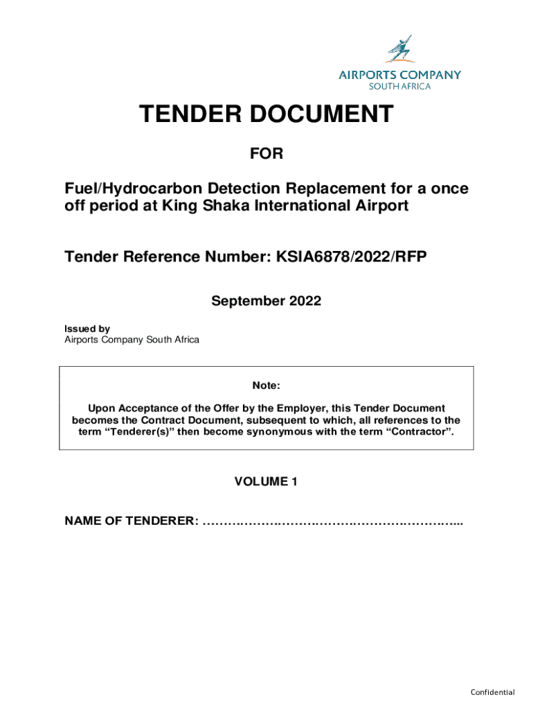 TENDER DOCUMENT FOR Fuel/Hydrocarbon Detection Replacement for a once off period at King Shaka International Airport Tender Reference Number: KSIA6878/2022/RFP September 2022 Issued by Airports Company