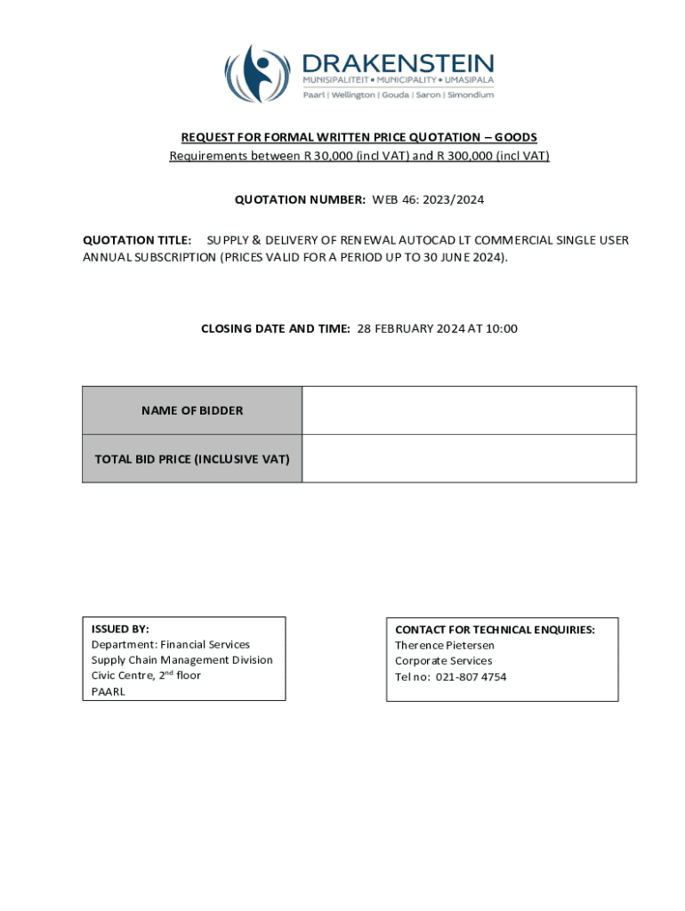 REQUEST FOR FORMAL WRITTEN PRICE QUOTATION GOODS Requirements between R 30,000 (incl VAT) and R 300,000 (incl VAT) QUOTATION NUMBER: WEB 46: 2023/2024 QUOTATION TITLE: SUPPLY & DELIVERY OF RENEWAL