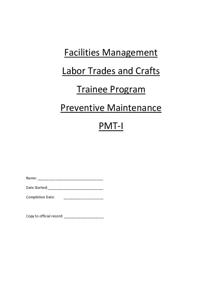 This document outlines the Facilities Management Trainee Program for Pipe Mechanical Trades I, detailing training sections, competencies, and practical examinations necessary for qualification.