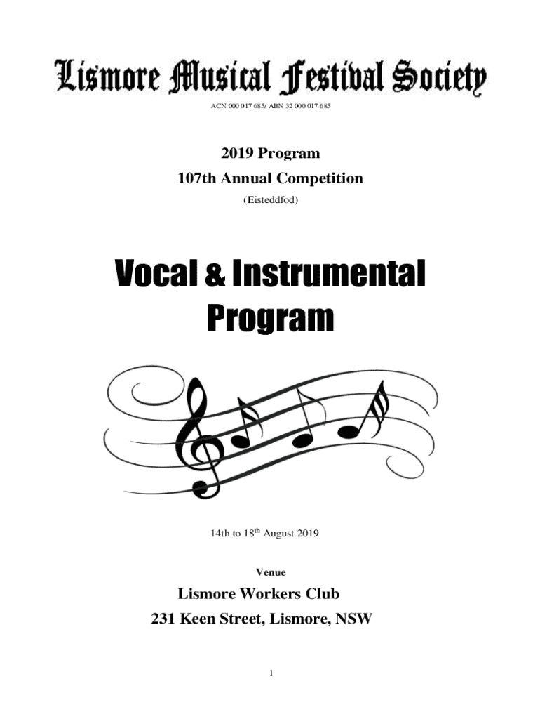 ACN 000 017 685/ ABN 32 000 017 6852019 Program 107th Annual Competition (Eisteddfod)Vocal & Instrumental Program14th to 18th August 2019VenueLismore Workers Club 231 Keen Street, Gilmore, NSW1ADMISSION