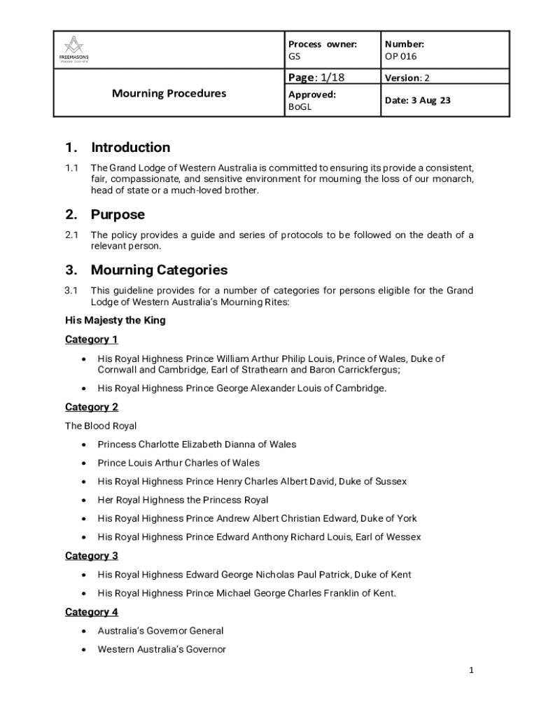 Mourning ProceduresProcess owner: Number: OP 016Page: 1/18Version: 2Approved: Cognate: 3 Aug 231. Introduction 1.1The Grand Lodge of Western Australia is committed to ensuring its provide a consistent,