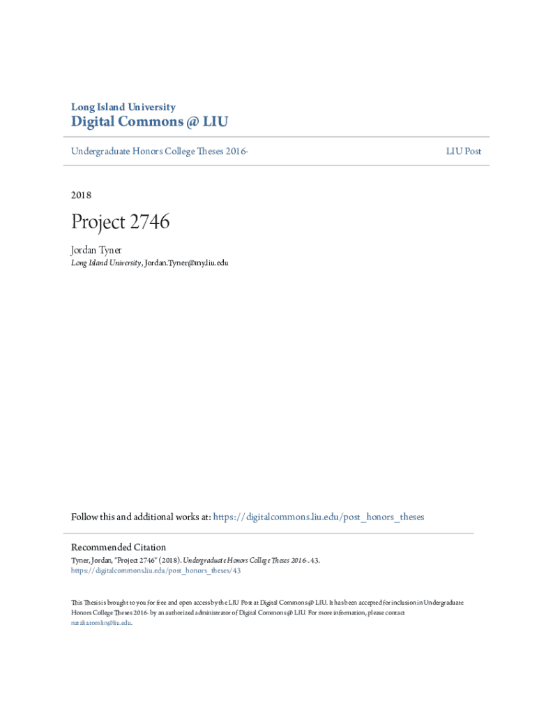 Long Island UniversityDigital Commons @ LIU Undergraduate Honors College Theses 2016LIU Post2018Project 2746 Jordan Tyner Long Island University, Jordan.Tyner@my.liu.eduFollow this and additional