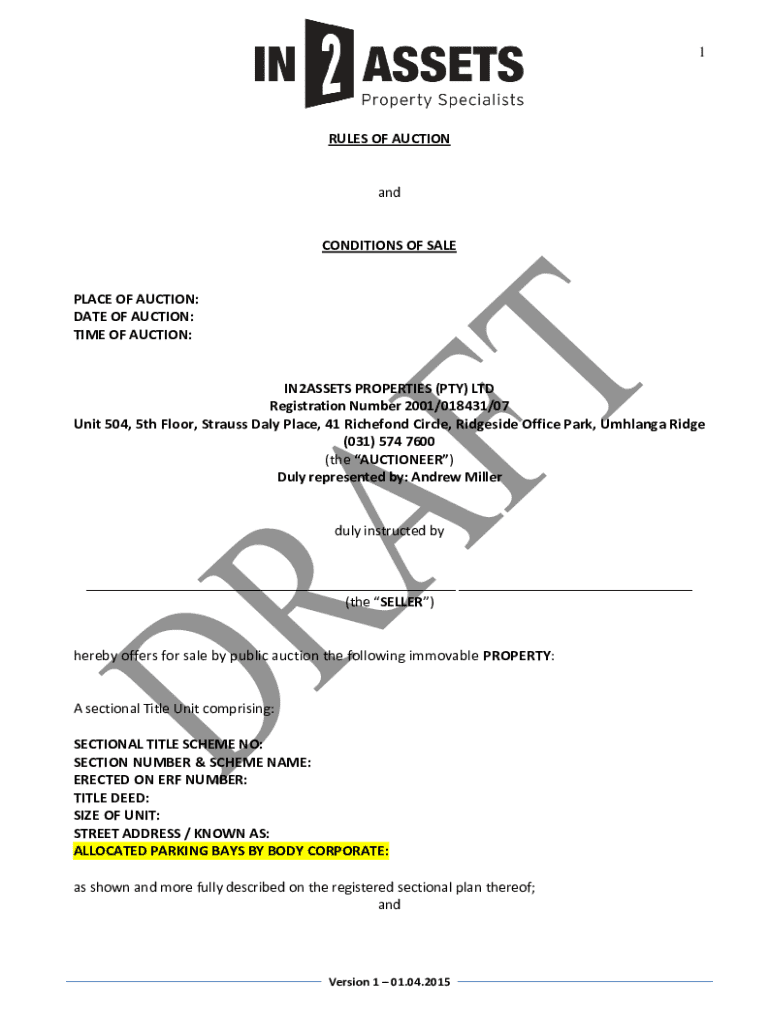 1RULES OF AUCTIONandCONDITIONS OF SALEPLACE OF AUCTION: DATE OF AUCTION: TIME OF AUCTION:IN2ASSETS PROPERTIES (PTY) LTD Registration Number 2001/018431/07 Unit 504, 5th Floor, Strauss Daly Place,