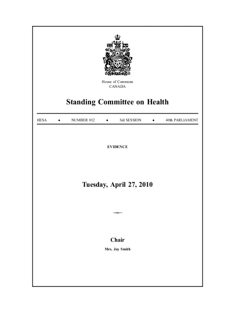 House of Commons CANADAStanding Committee on Health RENUMBER 0123rd SESSIONEVIDENCETuesday, April 27, 2010Chair Mrs. Joy Smith40th PARLIAMENT1Standing Committee on Health Tuesday, April 27, 2010 (0905)