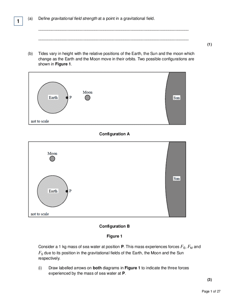 1(a)Define gravitational field strength at a point in a gravitational field. ___ ___ (1)(b)Tides vary in height with the relative positions of the Earth, the Sun and the moon which change as the Earth