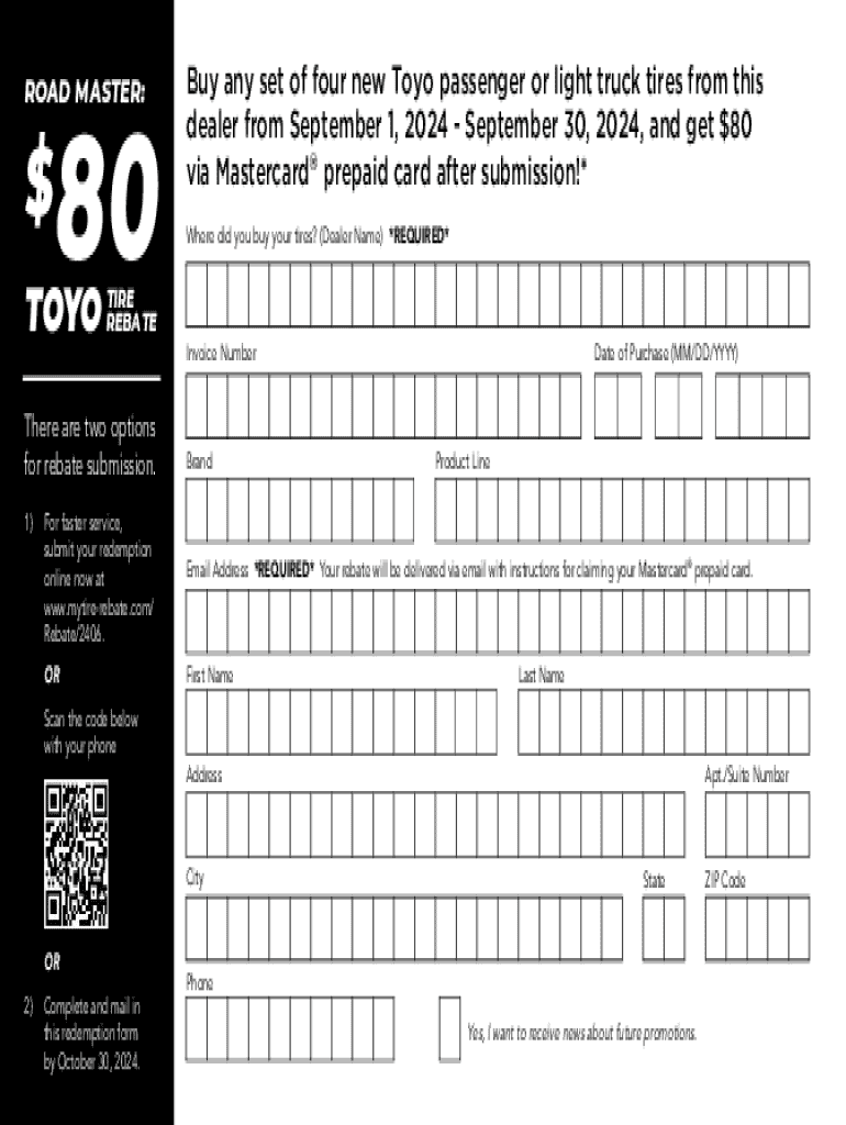 Take advantage of the 2024 Toyo Tire rebate! Buy four tires and get $80 via prepaid card. Submit your claim online or by mail by October 30, 2024.