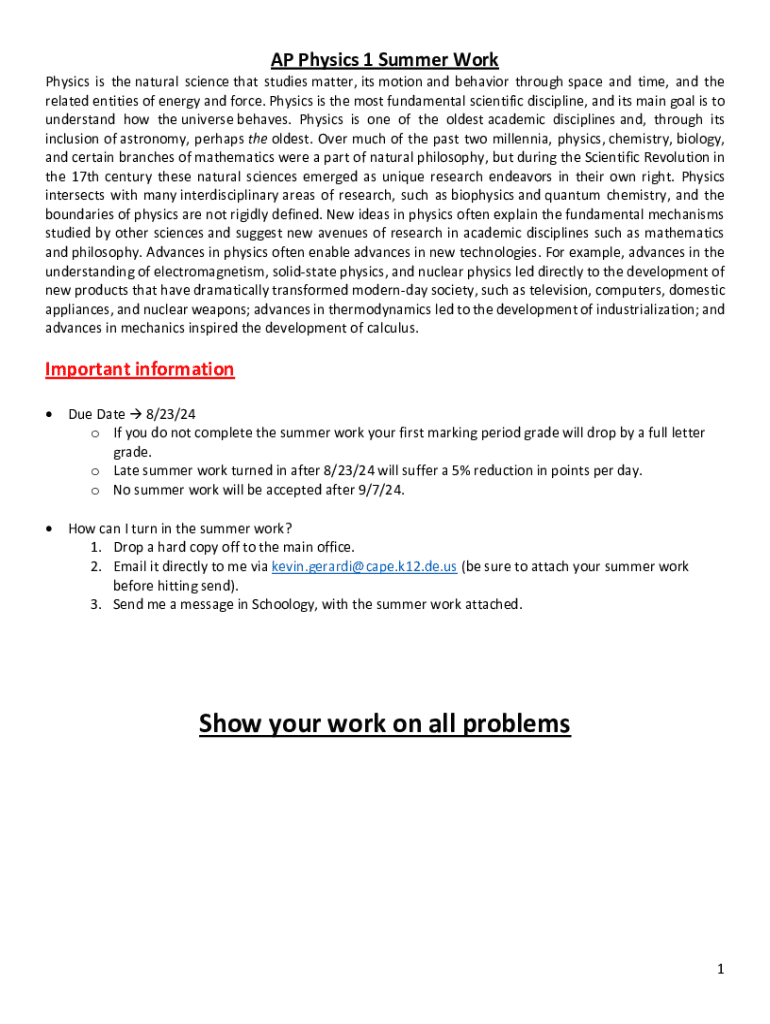 Get the free Ap Physics 1 Summer Work