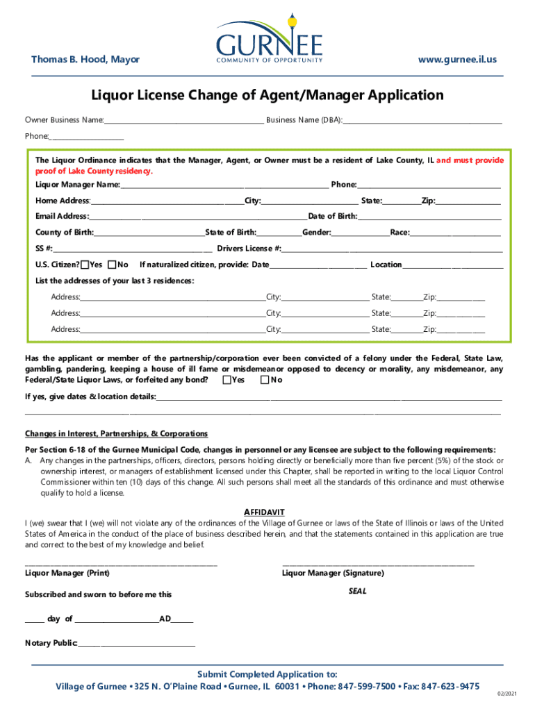 Apply for a change of agent or manager for liquor licenses in Gurney, IL. Ensure compliance with local regulations and residency requirements.