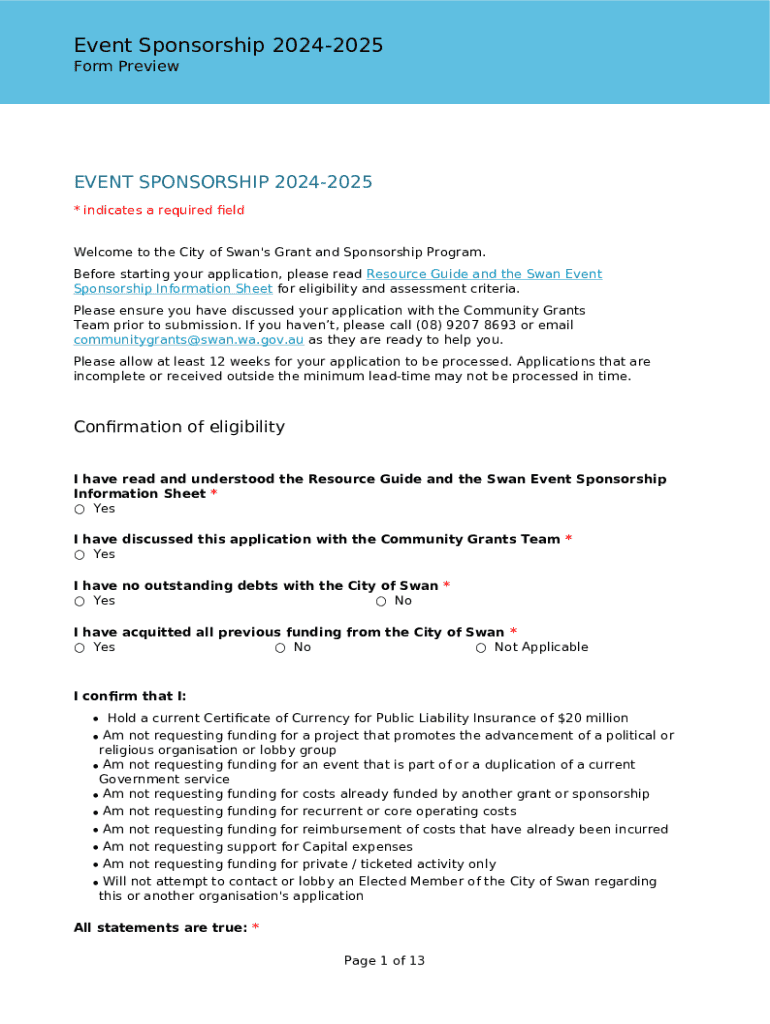 Event Sponsorship 20242025 Form PreviewEVENT SPONSORSHIP 20242025 * indicates a required eld Welcome to the City of Swan\'s Grant and Sponsorship Program. Before starting your application, please