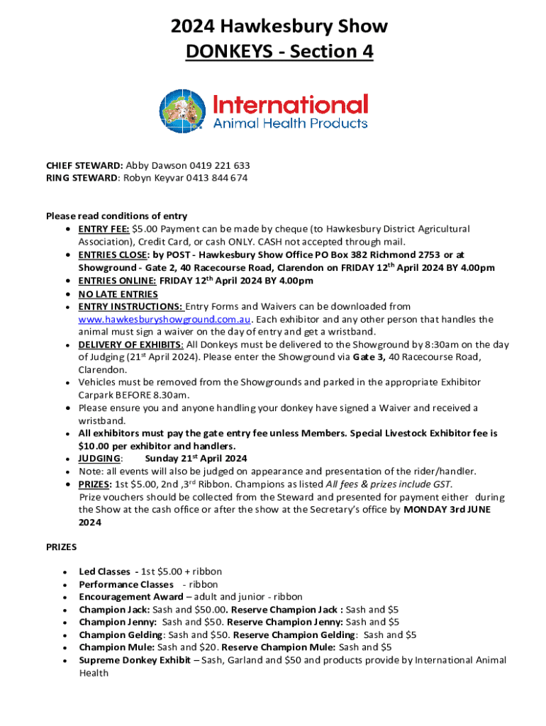 2024 Tewkesbury Show DONKEYS Section 4CHIEF STEWARD: Abby Dawson 0419 221 633 RING STEWARD: Robyn Key var 0413 844 674Please read conditions of entry FEE: $5.00 Payment can be made by check (to Tewkesbury
