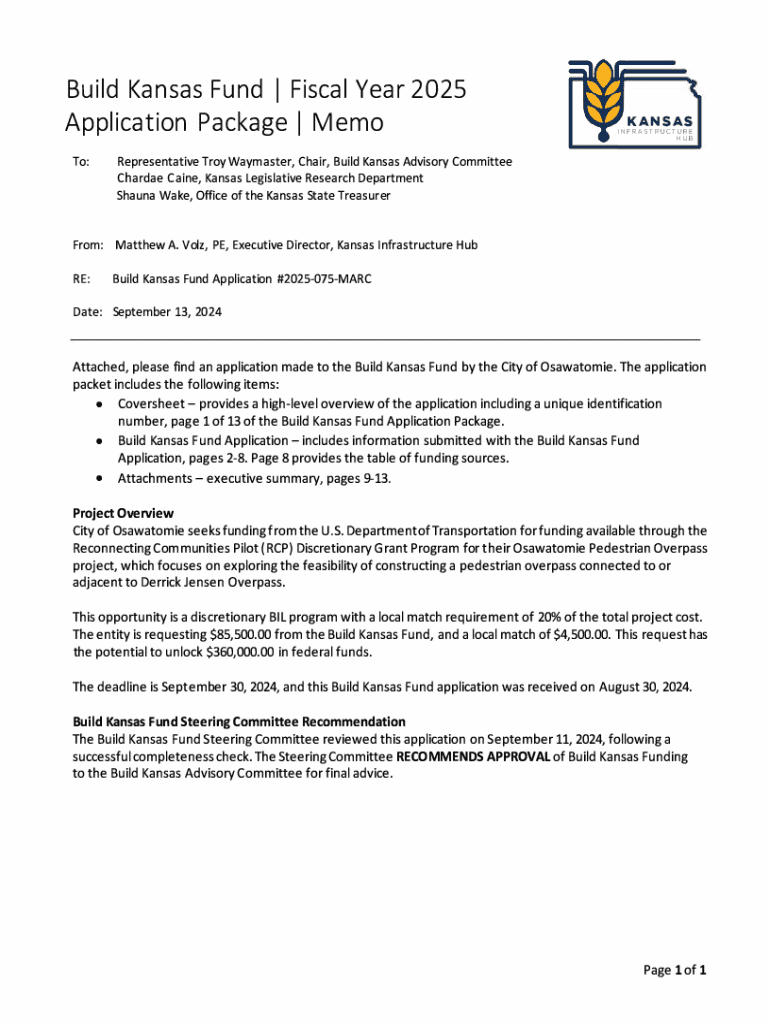 This document outlines the application for Build Kansas Fund to support the Pottawatomie Pedestrian Overpass project, enhancing community safety and connectivity.