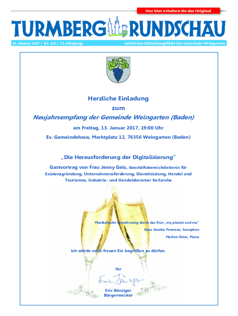 Beilagen12. January 2017 | NR. 1/2 | 72. JahrgangAmtliches Mitteilungsblatt her Demand WeingartenHerzliche Invading