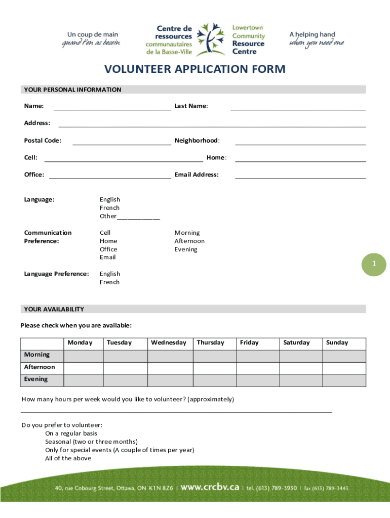 VOLUNTEER APPLICATION FORM YOUR PERSONAL INFORMATION Name:Last Name:Address: Postal Code:Neighborhood:Cell:Home:Office:Email Address:Language:English French Other___Communication Preference:Cell Home