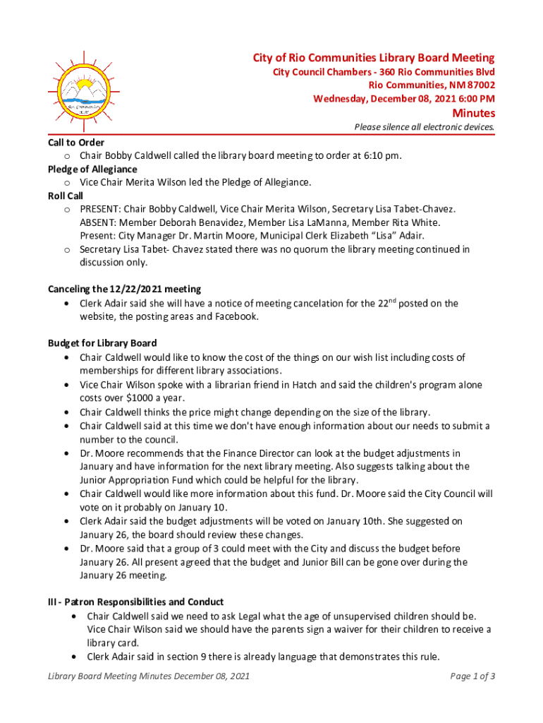 City of Rio Communities Library Board MeetingCity Council Chambers 360 Rio Communities Blvd Rio Communities, NM 87002 Wednesday, December 08, 2021 6:00 PMMinutesPlease silence all electronic devices.Call