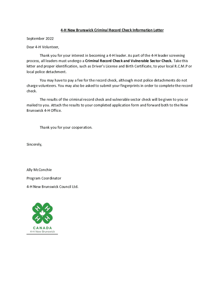 4H New Brunswick Criminal Record Check Information Letter September 2022 Dear 4H Volunteer, Thank you for your interest in becoming a 4H leader. As part of the 4H leader screening process, all leaders