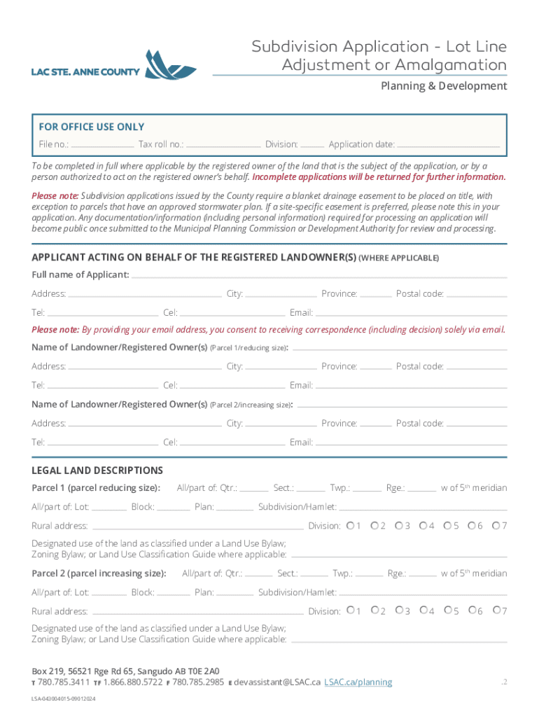 This document outlines the requirements and procedures for filing a subdivision application for lot line adjustments or amalgamations in Lac Ste. Anne County.