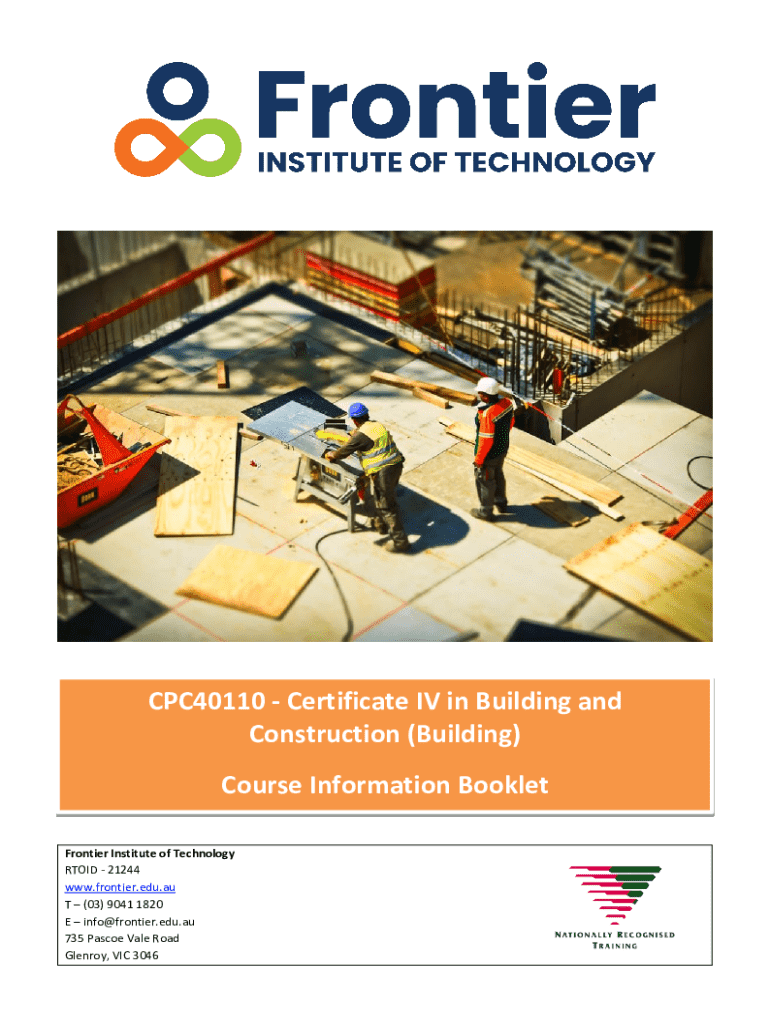 CPC40110 Certificate IV in Building and Construction (Building) Course Information Booklet Frontier Institute of Technology RTO ID 21244 www.frontier.edu.au T (03) 9041 1820 E info@frontier.edu.au