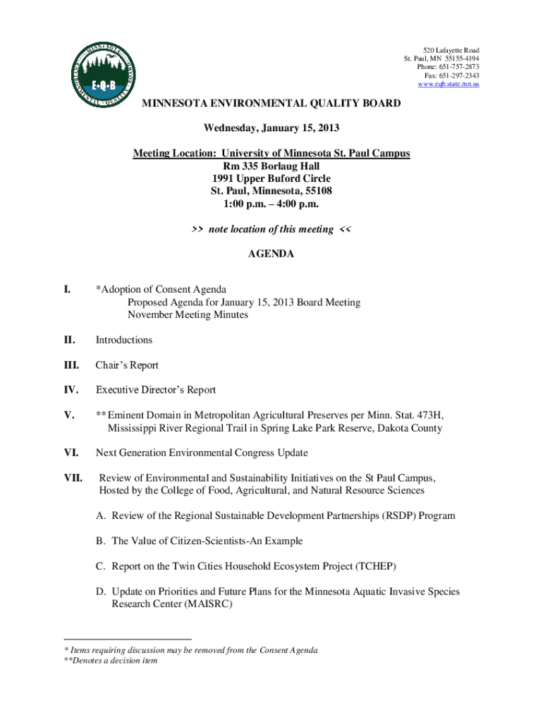520 Lafayette Road St. Paul, MN 551554194 Phone: 6517572873 Fax: 6512972343 www.eqb.state.mn.usMINNESOTA ENVIRONMENTAL QUALITY BOARD Wednesday, January 15, 2013 Meeting Location: University of Minnesota