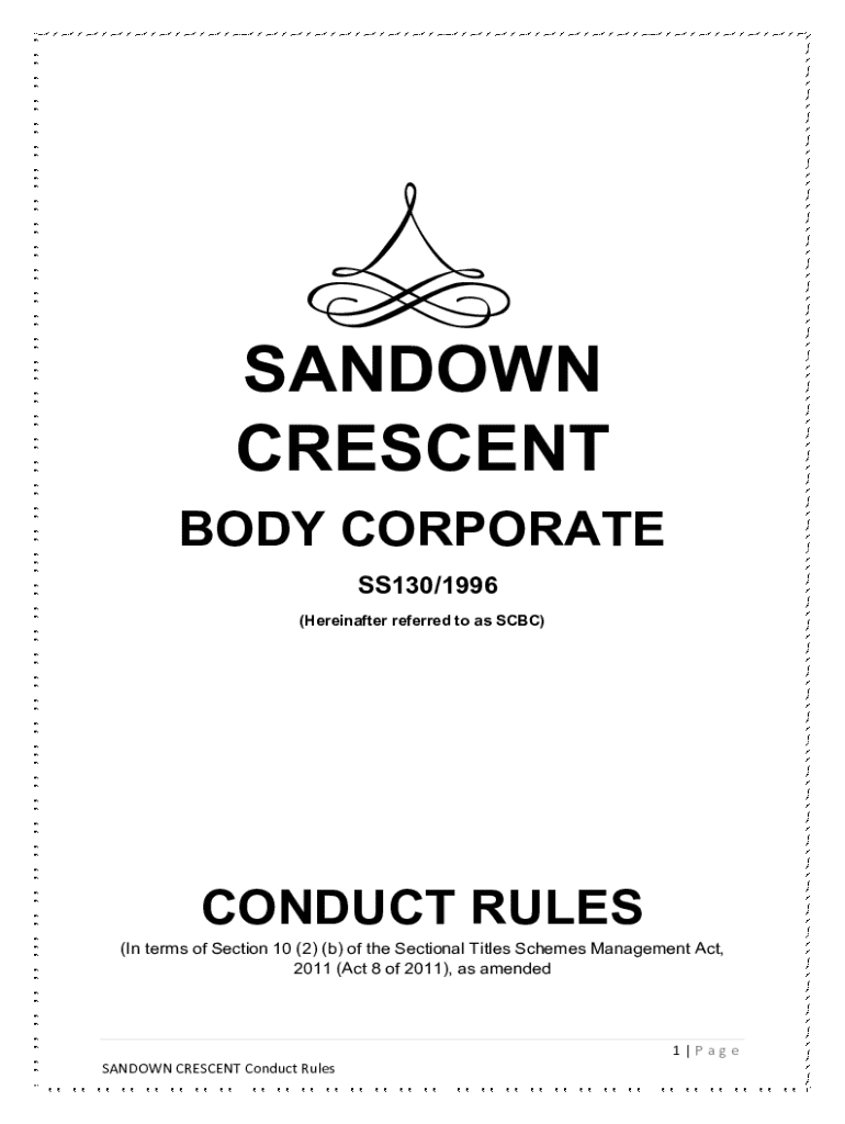 SANDOWN CRESCENT BODY CORPORATE SS130/1996 (Hereinafter referred to as SCBC)CONDUCT RULES (In terms of Section 10 (2) (b) of the Sectional Titles Schemes Management Act, 2011 (Act 8 of 2011), as amendedSANDOWN