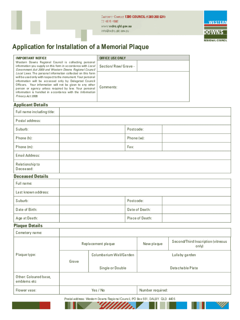 Complete the application to install a memorial plaque at Western Downs cemeteries. Ensure accurate details for a respectful tribute to your loved one.