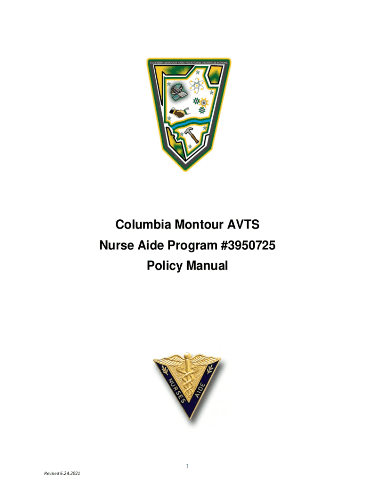 Columbia Montour AVTS Nurse Aide Program #3950725 Policy Manual1 Revised 6.24.2021ColumbiaMontour AVTS Adult Nurse Aide Program #725 Student Nurse Aide PoliciesPhilosophy The Nurse aide provides direct