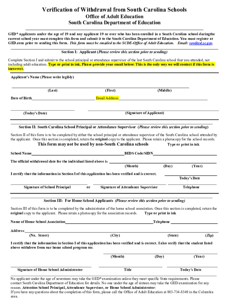 Verification of Withdrawal from South Carolina Schools Office of Adult Education South Carolina Department of EducationGED applicants under the age of 19 and any applicant 19 or over who has been