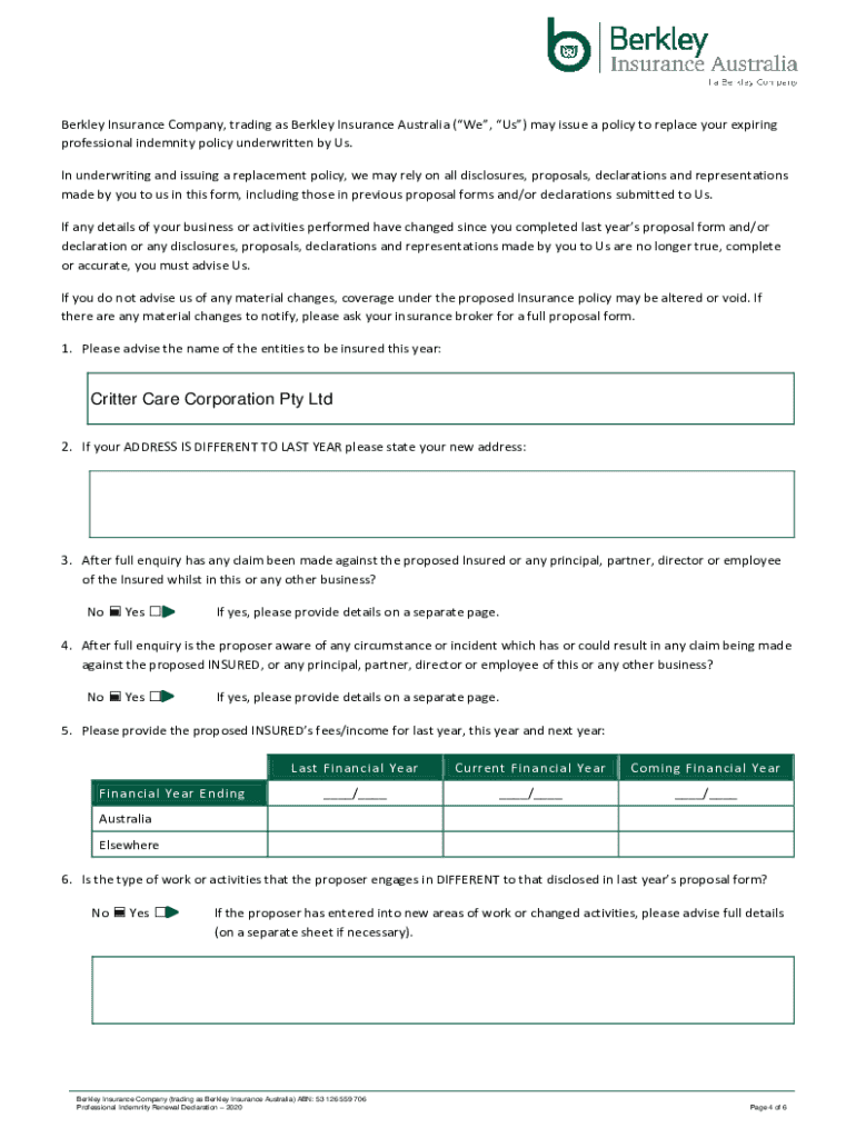 PROFESSIONAL INDEMNITY RENEWAL DECLARATION IMPORTANT INFORMATION: PLEASE READ THE FOLLOWING INFORMATION BEFORE COMPLETING THIS RENEWAL DECLARATION When completing the proposal you are obliged to report