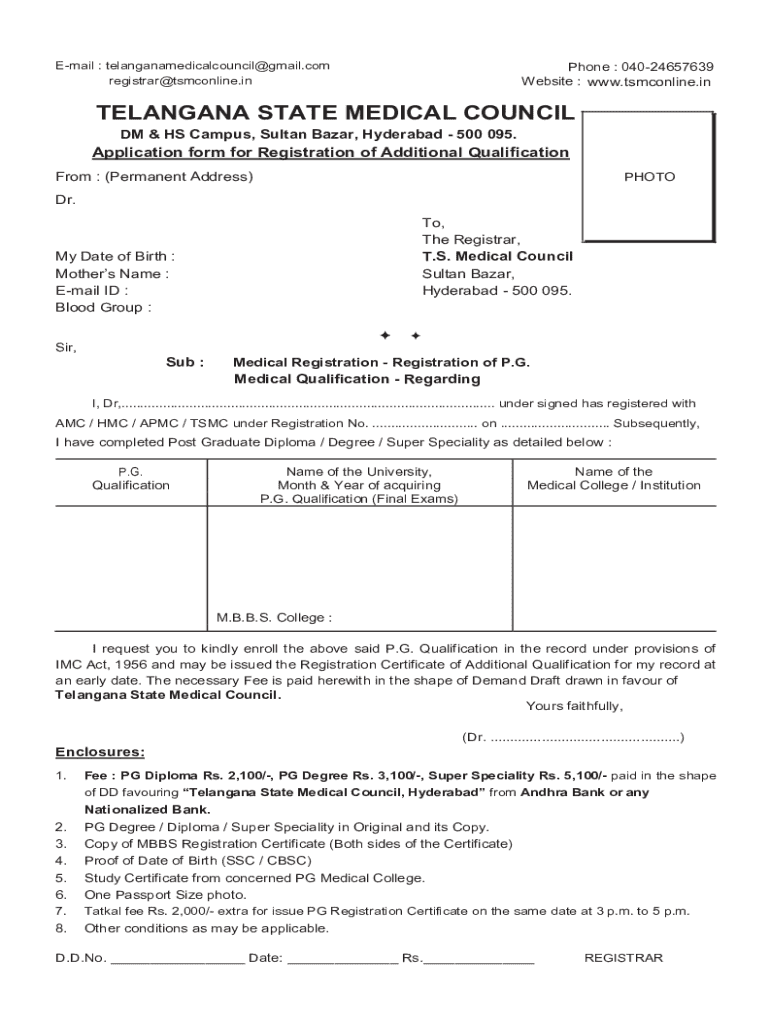 Email : telanganamedicalcouncil@gmail.com registrar@tsmconline.inPhone : 04024657639 Website : www.tsmconline.inTELANGANA STATE MEDICAL COUNCIL DM & HS Campus, Sultan Bazar, Hyderabad 500 095.Application