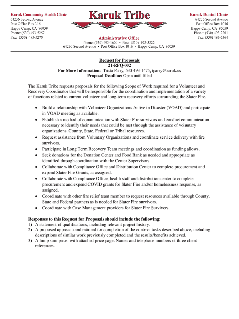 Request for Proposals 21RFQ002 For More Information: Trista Parry, 5304931475, tparry@karuk.us Proposal Deadline: Open until filledThe Karuk Tribe requests proposals for the following Scope of Work