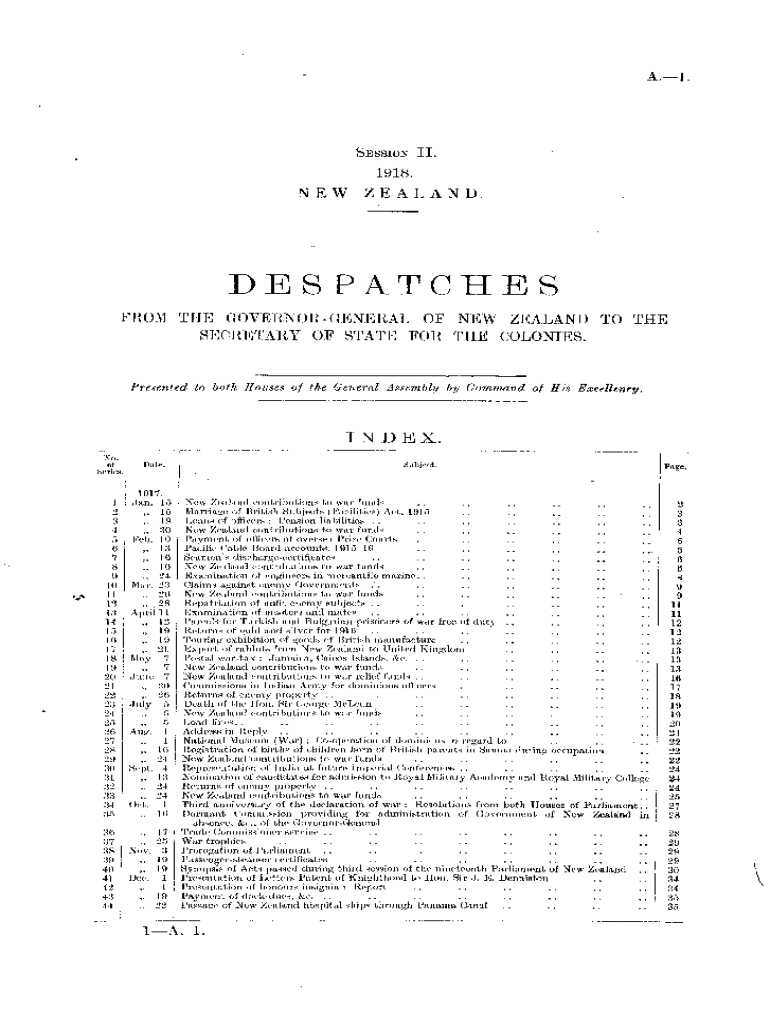A.session 11. 1918.NEW ZEALAND.DESPATCHES FROM THE GOVERNORGENERAL OF NEW ZEALAND TO THE SECRETARY OF STATE FOR THE COLONIES. Presented, to both Housemother General Assembly by Command of His Excellency.INDEX.