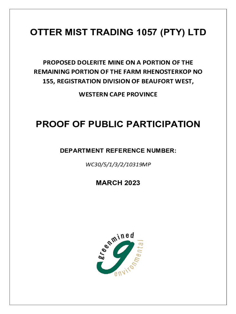 OTTER MIST TRADING 1057 (PTY) PROPOSED TOLERATE MINE ON A PORTION OF THE REMAINING PORTION OF THE FARM RHENOSTERKOP NO 155, REGISTRATION DIVISION OF BEAUFORT WEST, WESTERN CAPE PROVINCEPROOF OF PUBLIC