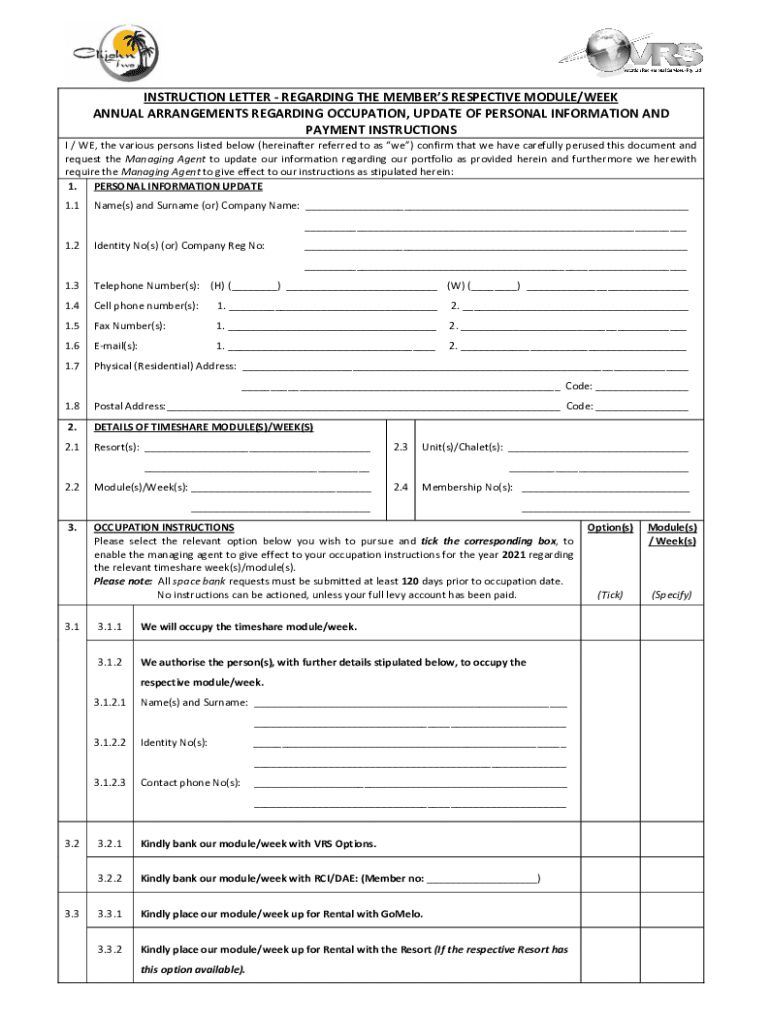 This document outlines the instructions for updating personal information, occupation details, and payment options for timeshare members for the year 2021.