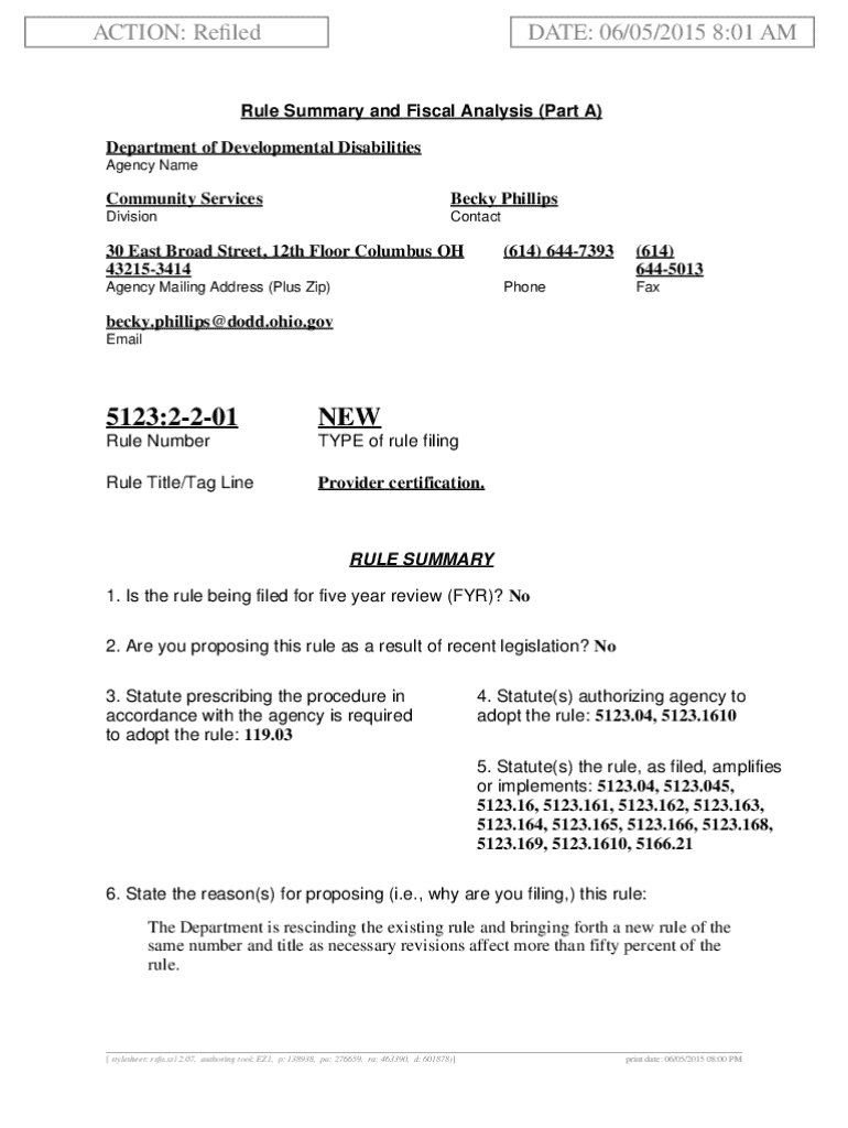 ACTION: RefiledDATE: 06/05/2015 8:01 Ampule Summary and Fiscal Analysis (Part A)