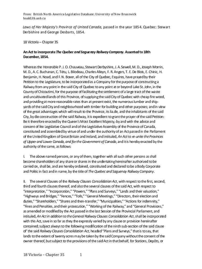 From: British North America Legislative Database; University of New Brunswick bald.lib.UNB.claws of Her Majesty\'s Province of United Canada, passed in the year 1854. Quebec: Stewart Derbyshire and