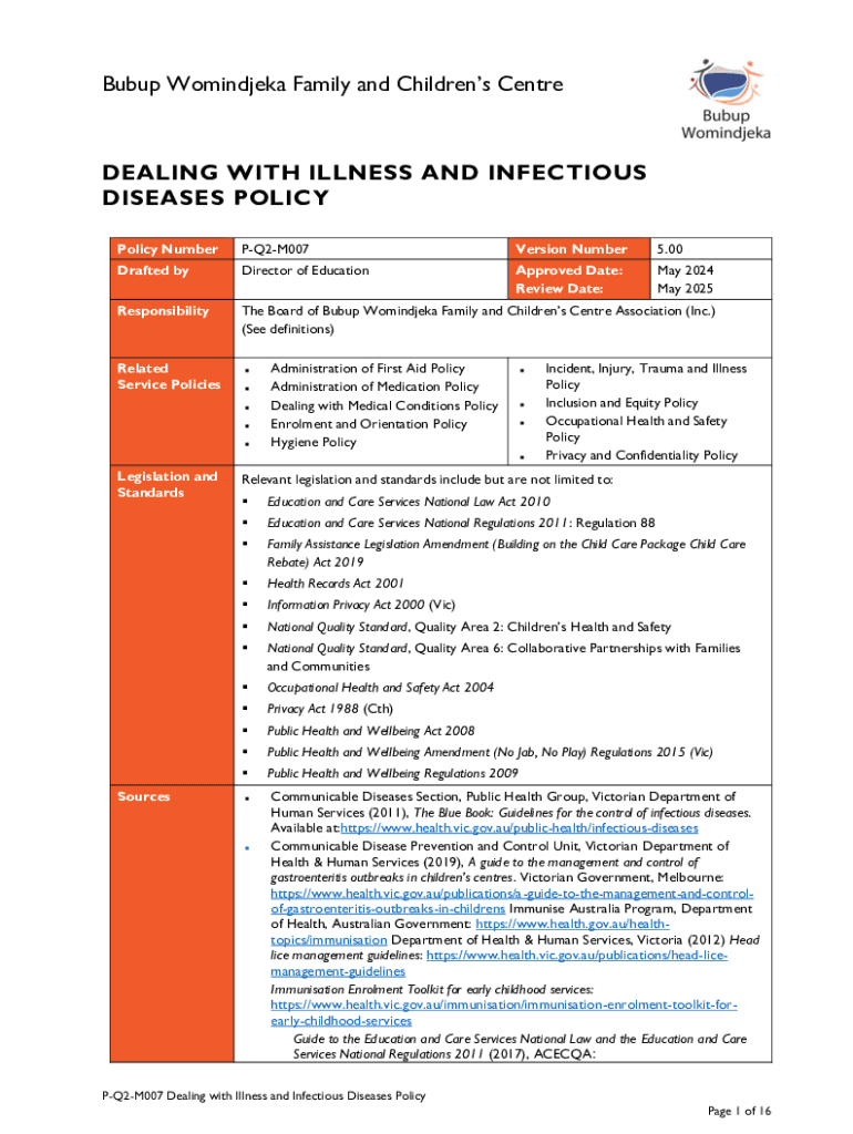 This policy outlines guidelines for managing illness and infectious diseases at Bubup Womindjeka, promoting a safe environment for children and compliance with health regulations.