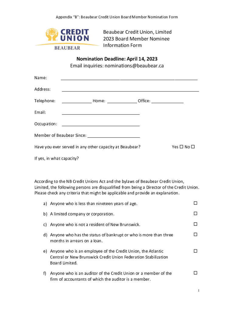 Appendix B: Beau bear Credit Union Board Member Nomination FormBeaubear Credit Union, Limited