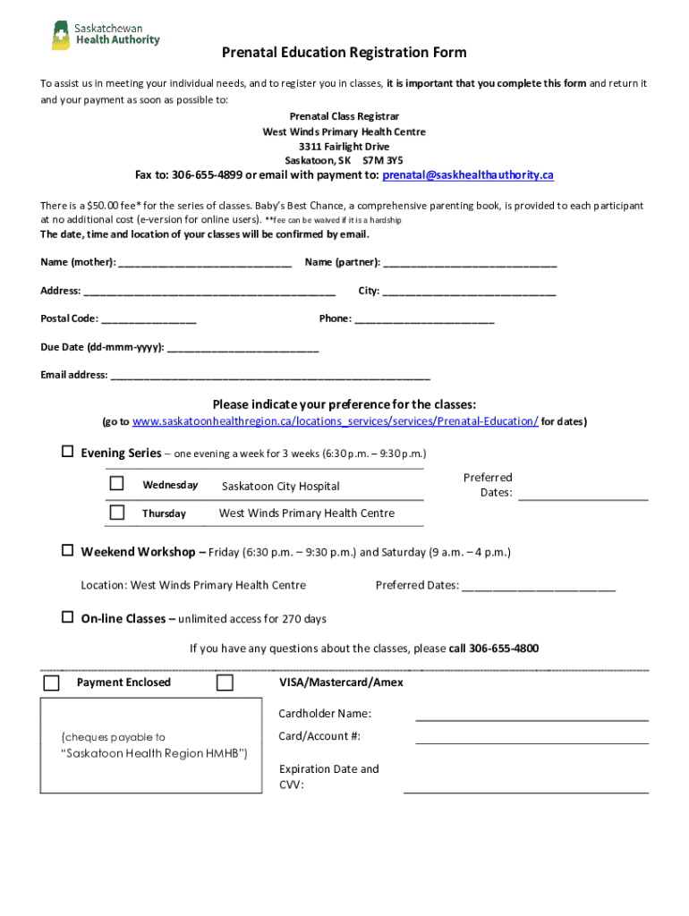 Prenatal Education Registration Form To assist us in meeting your individual needs, and to register you in classes, it is important that you complete this form and return it and your payment as soon