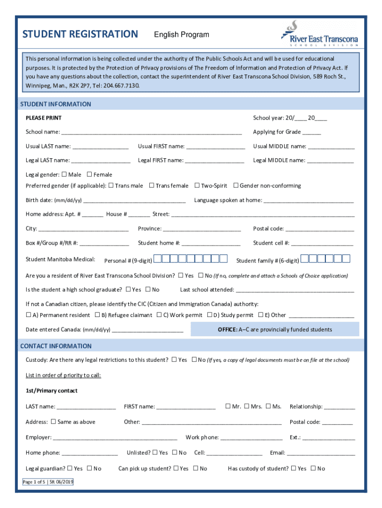 STUDENT REGISTRATION English Programs personal information is being collected under the authority of The Public Schools Act and will be used for educational purposes. It is protected by the Protection